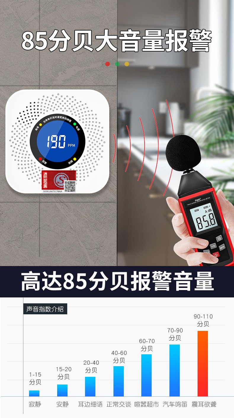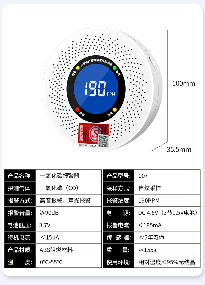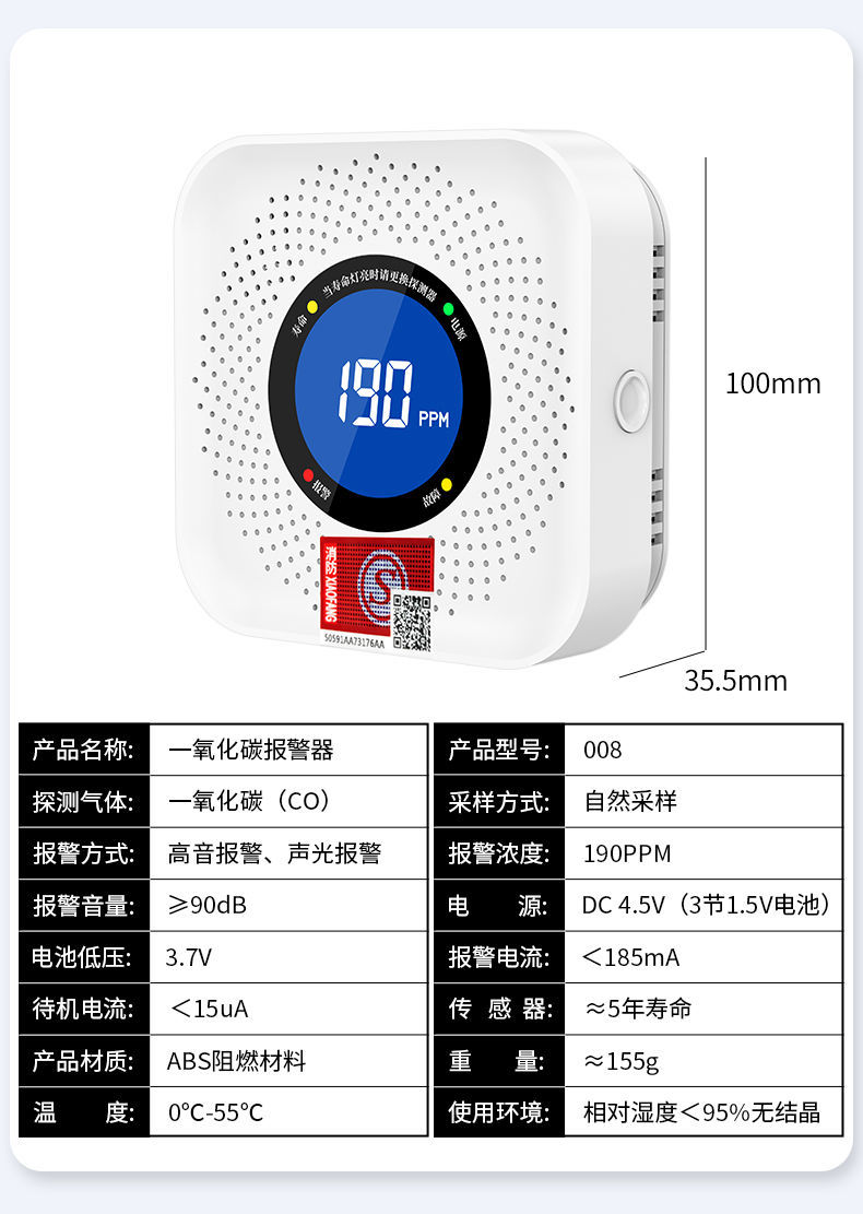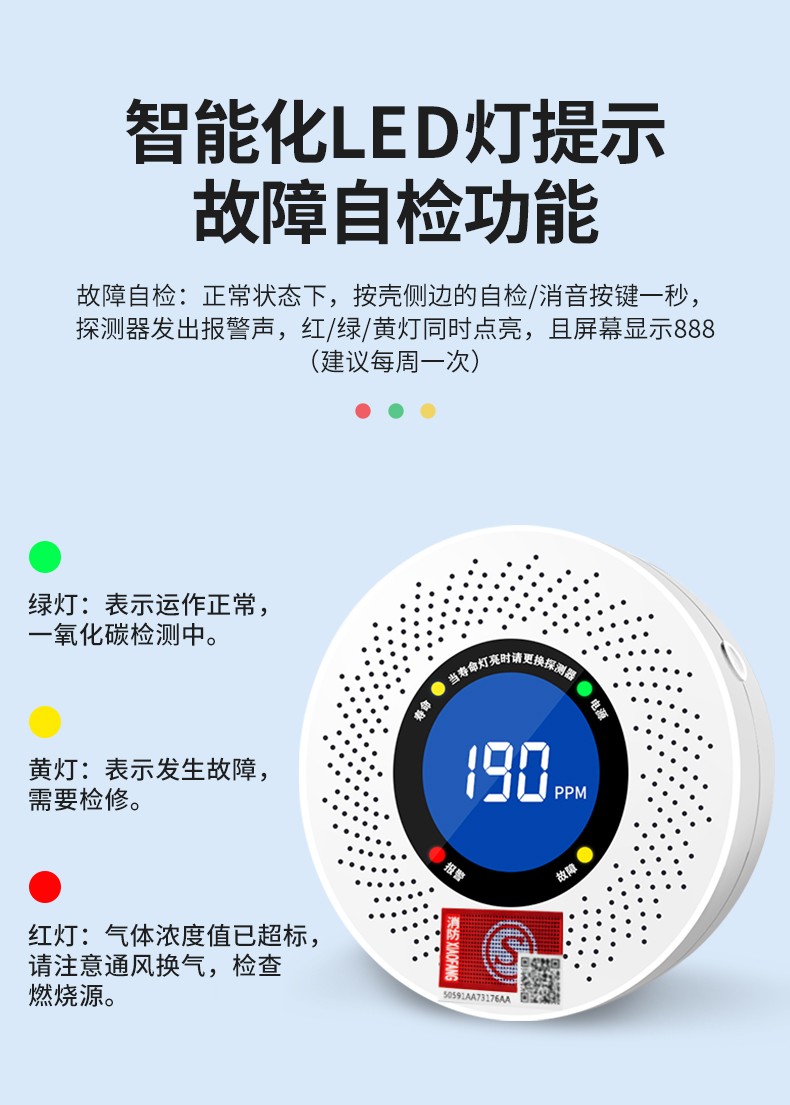 一氧化碳報警器(型號PA-007) 產(chǎn)品規(guī)格 功能特點 資料下載 一氧化碳報警器(型號PA-007)1.探測氣體:一氧化碳2.報警方式:高音報警、聲光報警3.材質(zhì):ABS阻燃材質(zhì)4.產(chǎn)品保險:1000萬承險適用場景:適用于廚房、浴室、起居室、火鍋包廂、飯?zhí)玫乳L時間空氣不流通的場所安裝一氧化碳報警探測器