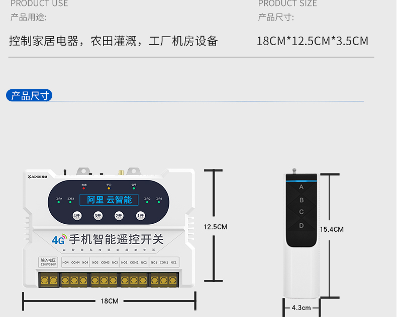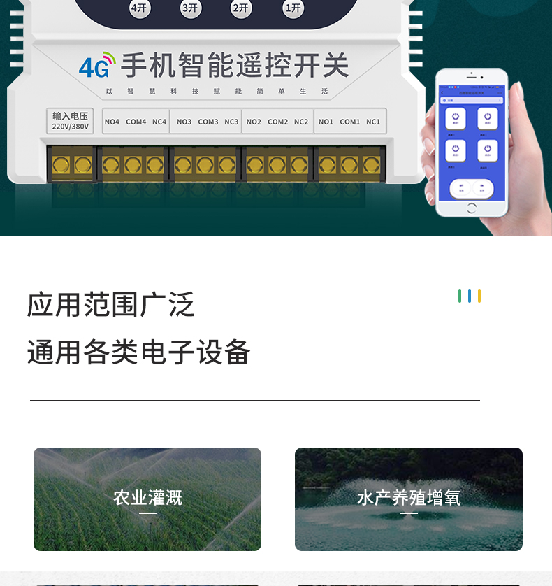 4G一路手機遠程遙控開關(guān)(A8系列) 產(chǎn)品規(guī)格 功能特點 資料下載 品名:GPRS手機遙控開關(guān) 型號:YS-A8-1 控制方式:手機APP/RF遙控/手動控制 傳輸方式:GPRS傳輸 控制距離:無限距離,手機有信號就能控制;(RF遙控器4000米) 工作電壓:220v、380v通用 產(chǎn)品尺寸:控制器180*125MM、遙控器136*43MM 用途:家電控制、農(nóng)田灌溉、工廠機房設備。多個控制器可在一個app上綁定控制!功能強大便捷!