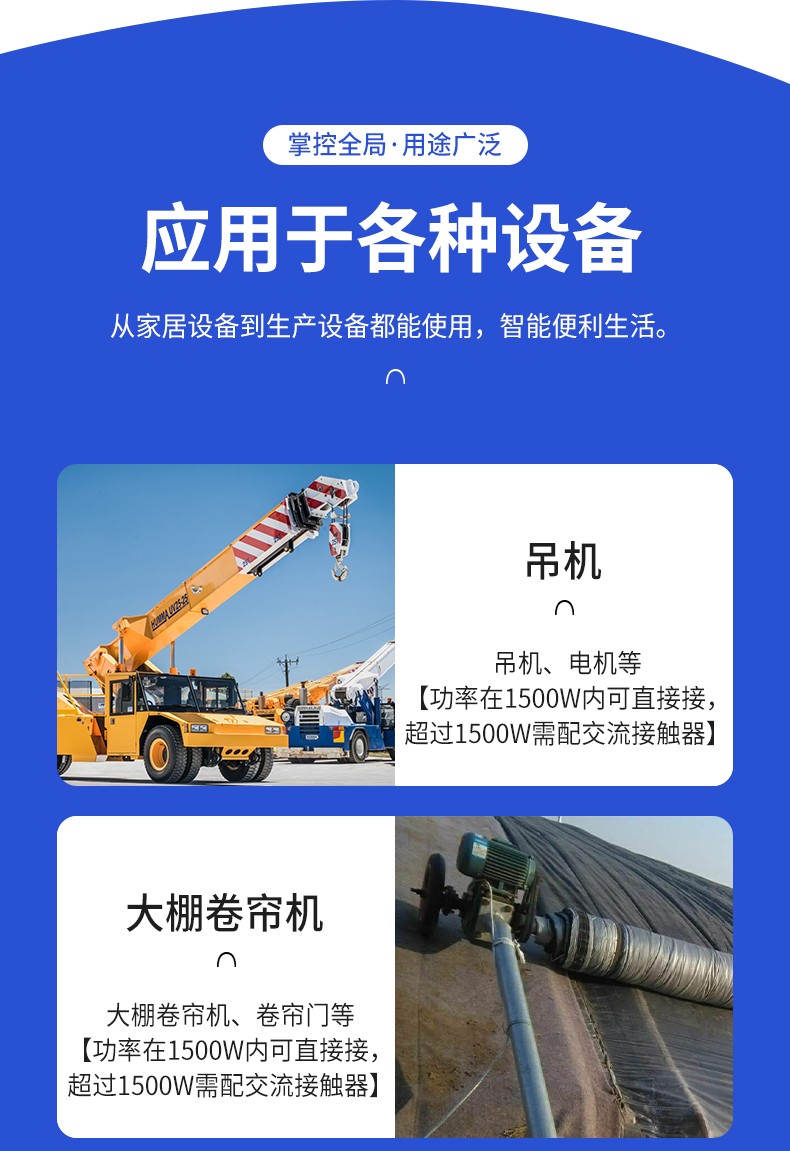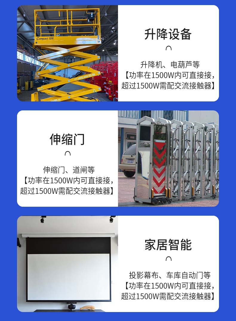 應(yīng)用場景:起吊設(shè)備 ,大鵬卷簾機(jī)、升降設(shè)備、正反轉(zhuǎn)電機(jī),工業(yè)信號(hào)控制, 投影幕布等