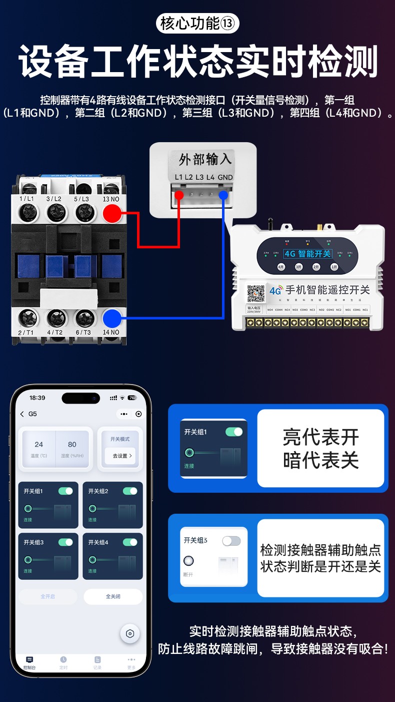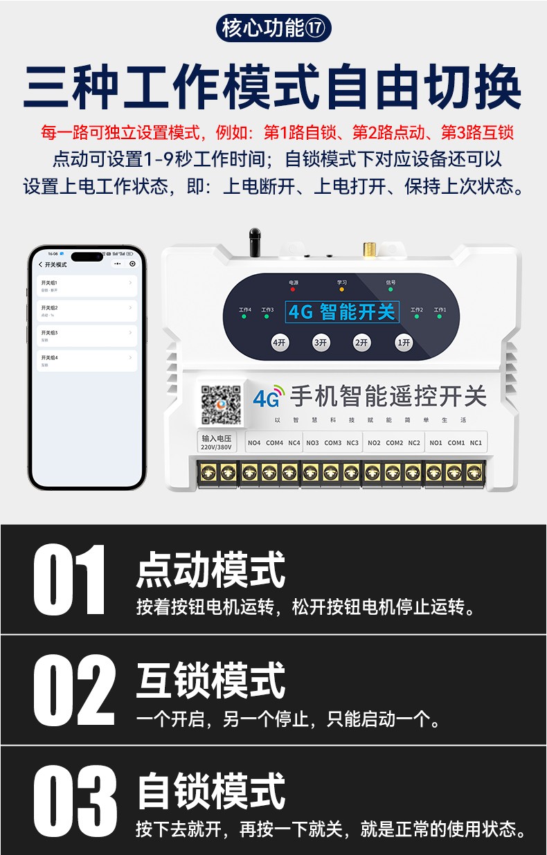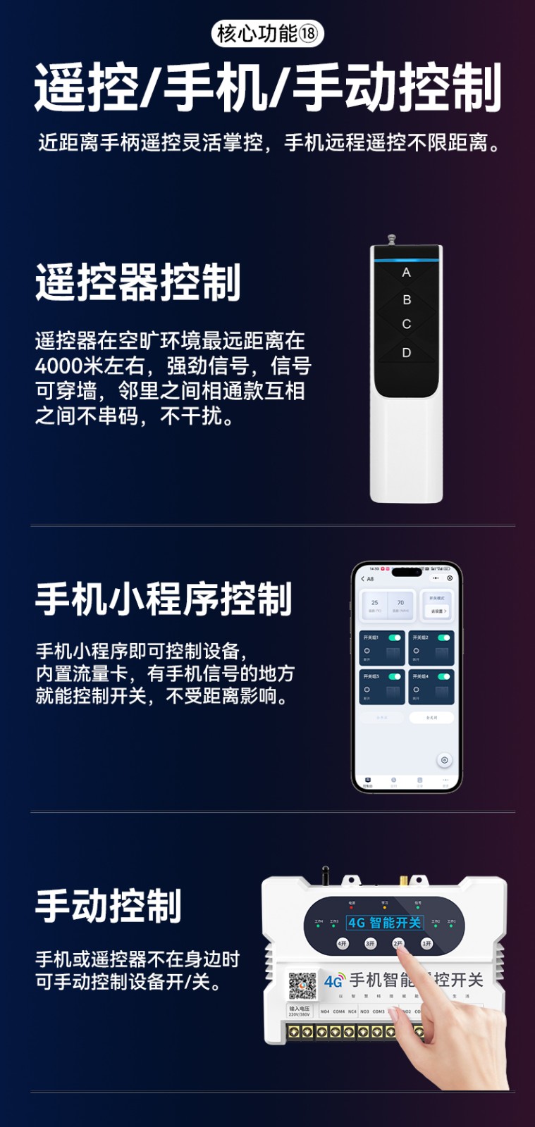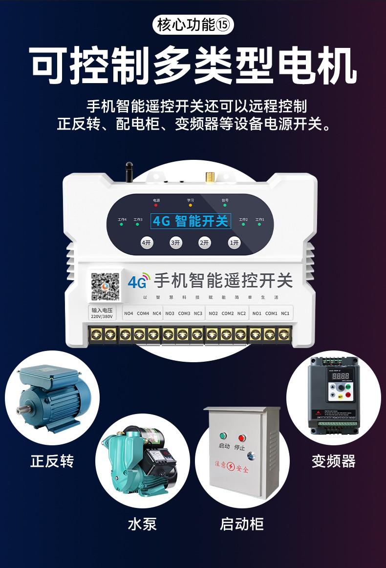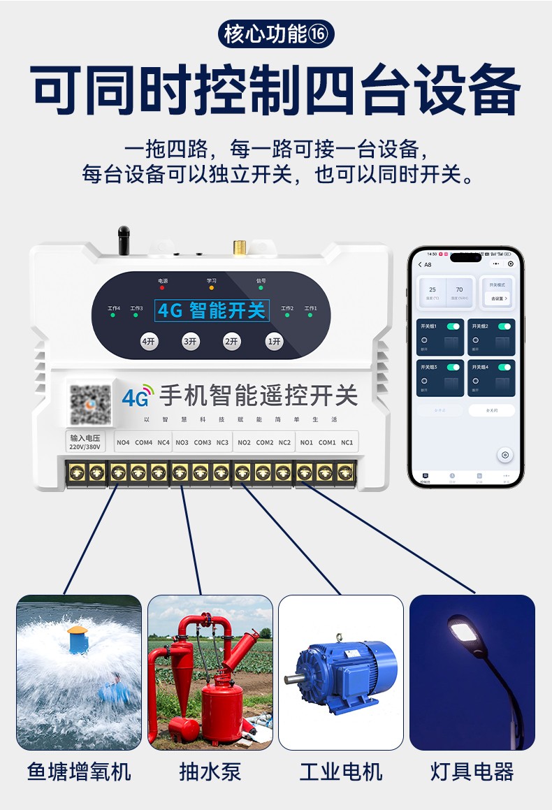 4G遠程控制開關(YS-A8) 產(chǎn)品規(guī)格 功能特點 資料下載 4G遠程控制開關(YS-A8)無需流量、無需插卡 、無需WIFI手機小程序控制定時開關:云端定時 、本地定時、 倒計時多人控制斷電提醒 +信息推送狀態(tài)檢測三種工作模式自動切換:點動模式 、互鎖模式 、自鎖模式工作電壓: 220v/380v (可選)應用場景:正反轉、水泵、啟動柜、變頻器 、魚塘增氧機、抽水泵、工業(yè)電機、燈具電器等