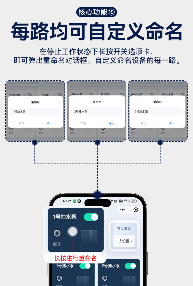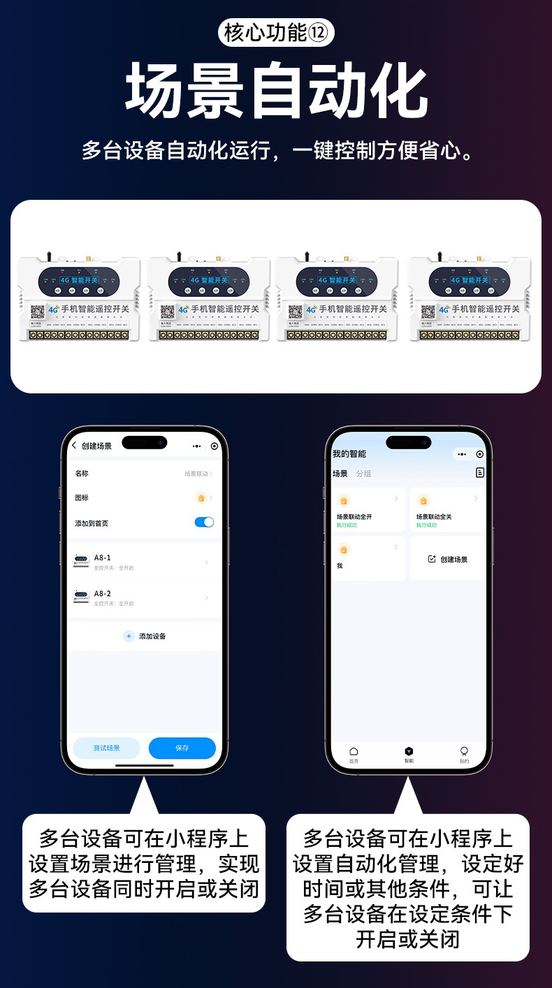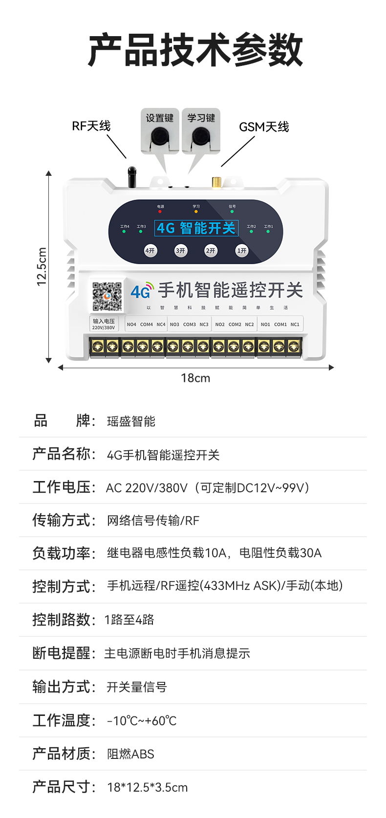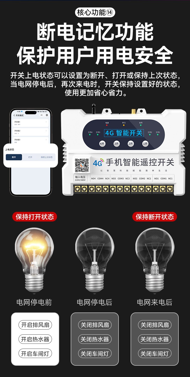4G遠程控制開關(YS-A8) 產(chǎn)品規(guī)格 功能特點 資料下載 4G遠程控制開關(YS-A8)無需流量、無需插卡 、無需WIFI手機小程序控制定時開關:云端定時 、本地定時、 倒計時多人控制斷電提醒 +信息推送狀態(tài)檢測三種工作模式自動切換:點動模式 、互鎖模式 、自鎖模式工作電壓: 220v/380v (可選)應用場景:正反轉、水泵、啟動柜、變頻器 、魚塘增氧機、抽水泵、工業(yè)電機、燈具電器等
