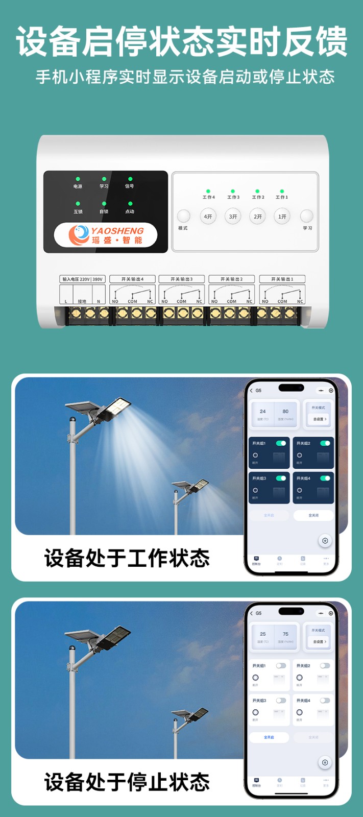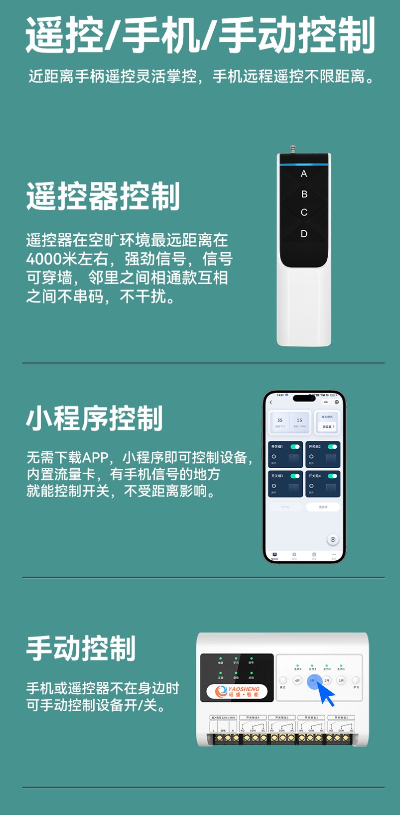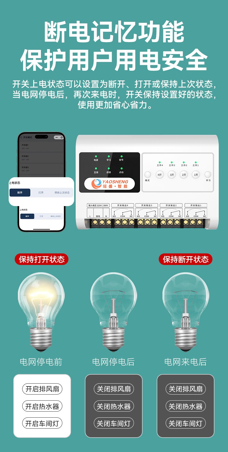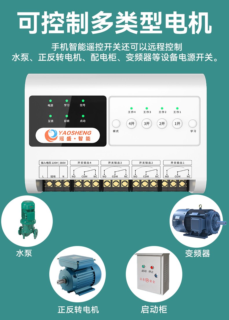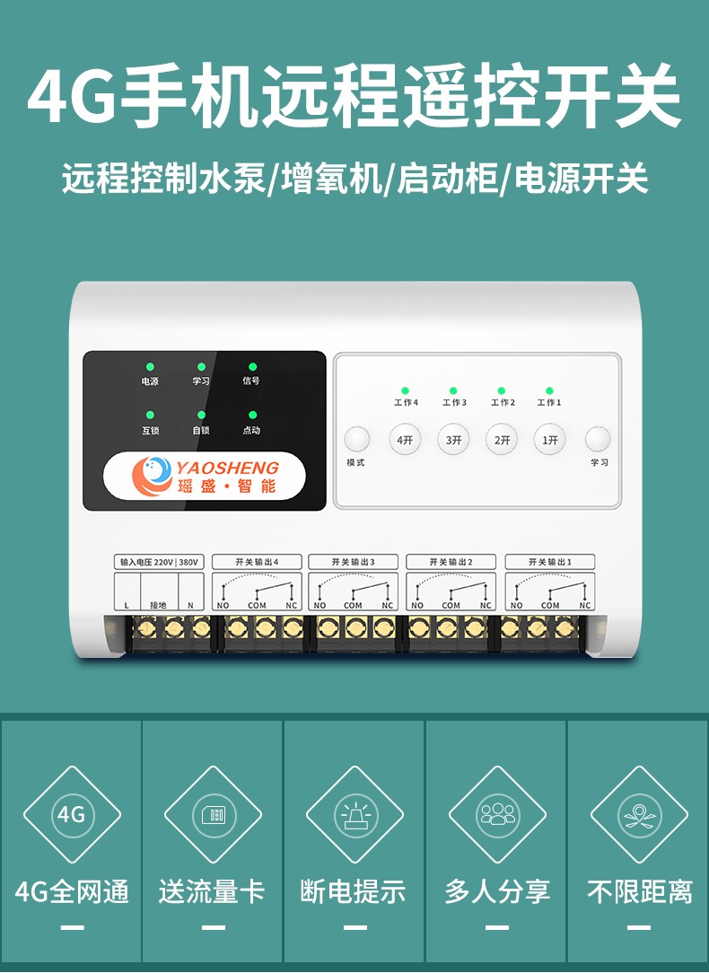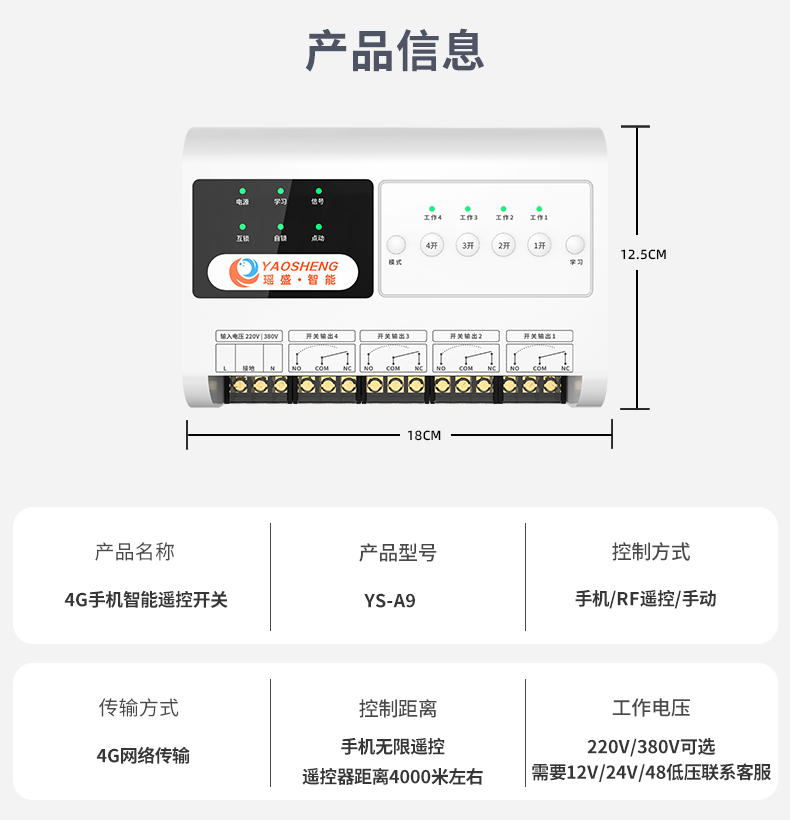 4G 遠程控制開關(YS-A9) 產品規(guī)格 功能特點 資料下載 4G 遠程控制開關(YS-A9)1.無需wifi 2.無線距離全國使用3.斷電報警 4.本地定時 、云端定時 、倒計時6.工作模式切換 :點動模式、互鎖模式、 自鎖模式7.多人管理控制 8.設備工作狀態(tài)檢測9.設備啟動反饋10.溫度實時檢測11.可自定義命名控制方式:遙控器控制 、手機小程序控制 、手動控制工作電壓:220v/380v 應用場景:農業(yè)灌溉/魚塘增氧/電工維修/工控設備/各類電機/ 溫室花盆